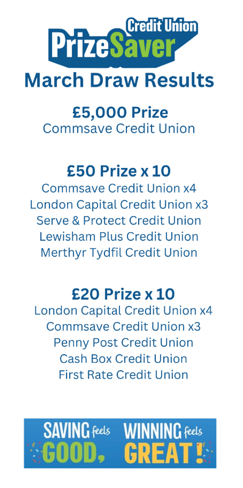 ... but winning feels great!PrizeSaver account is a UK wide credit union savings account with monthly prizes open to all of our participating members. Every pound in your PrizeSaver account balance enters you into a monthly prize draw (up to 200 entries pcm). There are 21 prizes up for grabs every single month, with a grand prize of £5,000 and twenty further prizes of not less than £20.